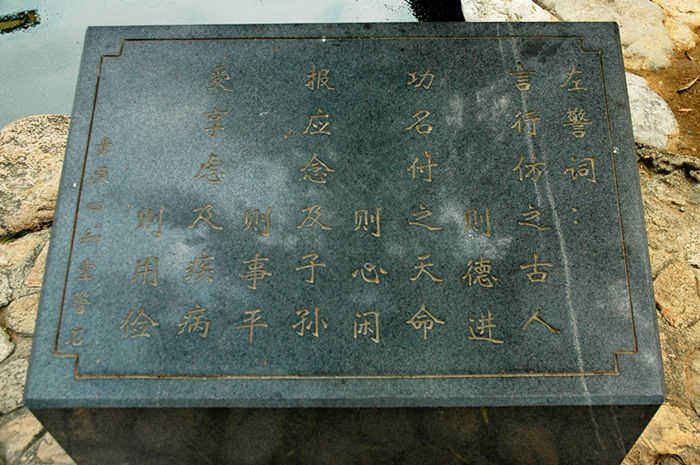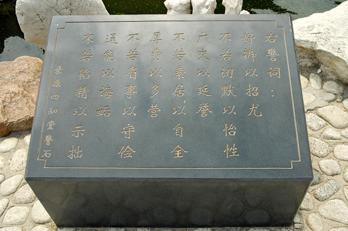 故事传承千年,道理细润万家。今天,“四知苑”以其独特的内涵,教育、警醒着现代人。楼阁周围有两块石刻,分别是左警词、右警词,出自明万历年间莱州府知府阎士选撰的《汉东莱郡太守杨先生传》。